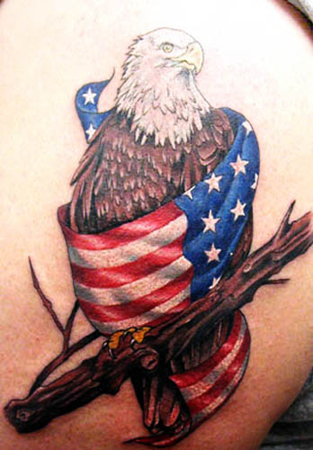 The majority of tribal eagle tattoo designs feature the American bald eagle. These large, strong birds are often depicted with wings spread wide, and a determined expression on their face. They have broad, brown wings; a white head, yellow beak and talons and striking golden eyes. These tribal eagle tattoo designs are generally shown alongside a swaying American flag, or intertwined with the body of the bird. One idea for this particular design is to place the eagle in flight, with the flag as part of its flapping wings.